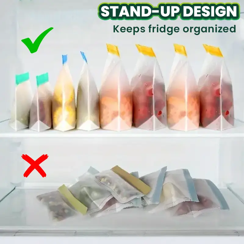 STAND-UP DESIGN WITH EXTRA CAPACITY: The innovative flat-bottom design allows FreshLock to stand upright on their own, making storage in your refrigerator neat and organized. Their spacious interior provides 20% more capacity than standard storage bags, giving you plenty of room for all your foods while maximizing fridge space.