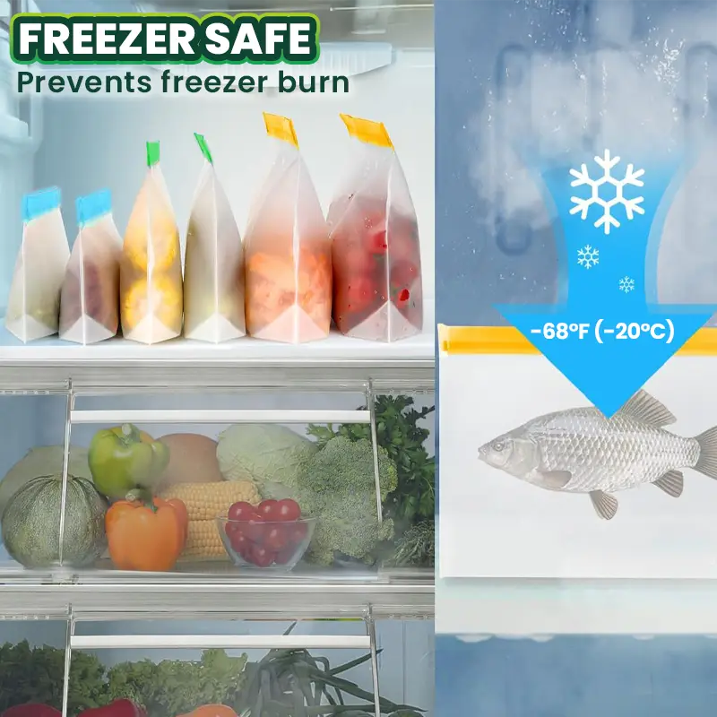 FREEZER AND DISHWASHER SAFE: Protect your food from freezer burn with FreshLock's freezer-safe design. When it's time to clean, simply toss them in the dishwasher. These extra thick, tear-resistant bags are built to withstand countless uses while maintaining their quality and effectiveness.