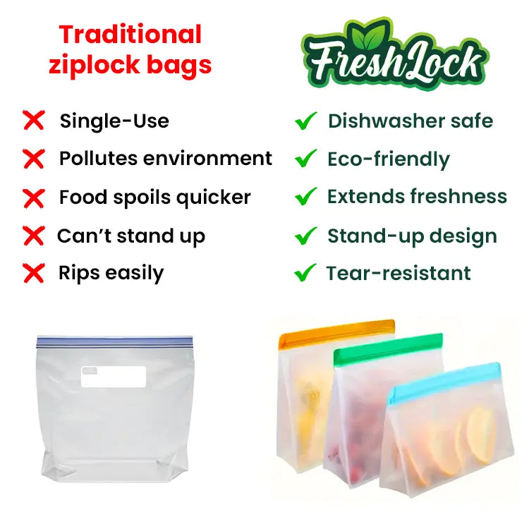 FOOD-GRADE AND 100% SAFE: Made from premium food-grade PEVA, FreshLock is completely PVC-free, lead-free, chloride-free and BPA-free so they're safe for storing all your favorite foods. Our high-quality material ensures your family's food stays fresh without harmful chemicals.